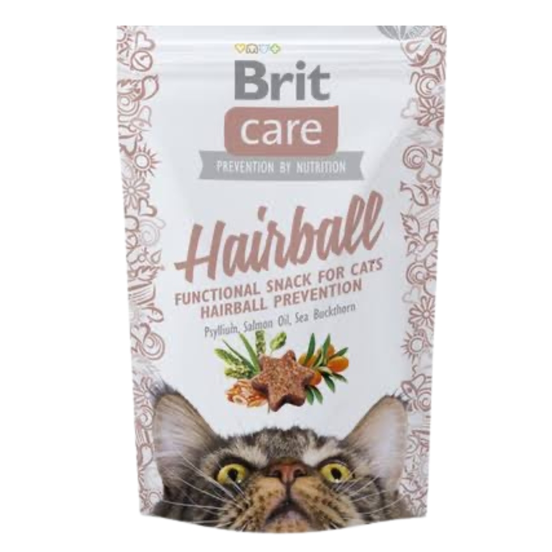 Grain-free, additive-free, and utterly scrumptious! Brit Care Cat Snack HairballThis semi-moist supplementary food with duck is designed for cats. It's a functional treat aimed at preventing hairballs, enriched with psyllium, salmon oil, sea buckthorn, and lignocellulose. Ingredients:22% dehydrated duck, yellow peas, liquid and tapioca starch, 10% hydrolysed chicken protein, collagen, 5% lignocellulose, 5% salmon oil, 4% sea buckthorn, 4% psyllium, hydrolysed chicken liver Analytical Constituents:26% crude protein, 9% fat content, 17% moisture, 6% crude ash, 4% crude fibre, 0.7% calcium, 0.6% phosphorus, 0.5% sodium Nutritional Additives:2,500 mg of Taurine (3a370) Preservatives authorised by the EU: citric acid (E330), DL-malic acid (E296) Serve as a treat, ideally by hand, after meals, before bedtime, or in the morning following breakfast. Each package contains 50g.