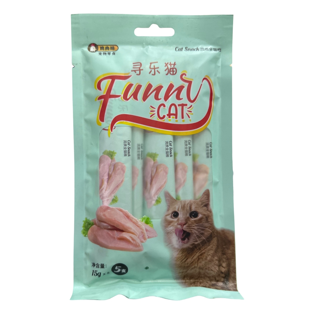 Main ingredients COMPOSITION CHICKEN BREST, MARINE FISH, CORN STARCH NUTRITIONAL ADDITIVES Xanthan gum, compound phosphate (water retention agent) Product composition analysis guarantee value ANALYTICAL CONSTITUENTS Crude protein ≥ 9.12% Crude fat ≥ 2.4% Crude ash ≤ 0.68% Crude fibre ≤0.1% Moisture Moisture < 84.4% RECOMMENDED DAILY INTAKE CAT: MARK THE WEIGHT, AND FEED 3 TO 6 DUS A DAY; Please feed the cat according to its size. Young cats: 4 weeks to 12 weeks old, feeding 1 cat a day; Young cats over 12 weeks old can be fed 2 to 3 cats a day; Feeding kittens can mix food as appropriate, which helps to improve the appetite of kittens. Packaging: 15g x 5 Implementation standard: Q/1321CN006-2020 shelf life: 24 months (unopened state), preservation method: avoid direct sunlight, store at room temperature. Attention to consumption: open the bag and eat immediately. If the bag is swollen, mouldy, etc., please do not feed it; After opening a single one, please feed it immediately. Do not eat it multiple times. Production date: see the seal of the bag Production enterprise: Shandong Chongni Biotechnology Co., Ltd. Production address: Economic Development Zone, Puwang Town, Yinan County, Linyi City, Shandong Province